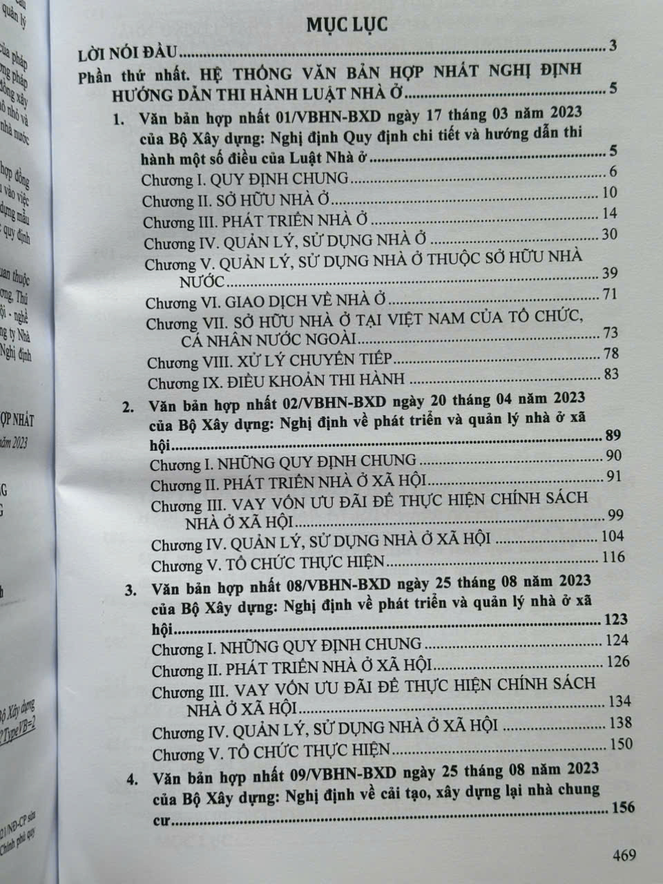 Thời gian qua Bộ Xây dựng đã ban hành nhiều văn bản hợp nhất các Nghị định liên quan đến chính sách phát triển nhà ở theo Luật Nhà ở và quy định chi tiết về quản lý chất lượng, thi công xây dựng, bảo trì công trình và quản lý chi phí đầu tư xây dựng cụ thể như: Văn bản hợp nhất 08/VBHN-BXD ngày 25 tháng 08 năm 2023 của Bộ Xây dựng: Nghị định về phát triển và quản lý nhà ở xã hội; Văn bản hợp nhất 09/VBHN-BXD ngày 25 tháng 08 năm 2023 của Bộ Xây dựng: Nghị định về cải tạo, xây dựng lại nhà chung cư; Văn bản hợp nhất số 10/VBHN-BXD ngày 25 tháng 08 năm 2023 của Bộ Xây dựng: Nghị định quy định chi tiết và hướng dẫn thi hành một số điều của Luật Nhà ở …