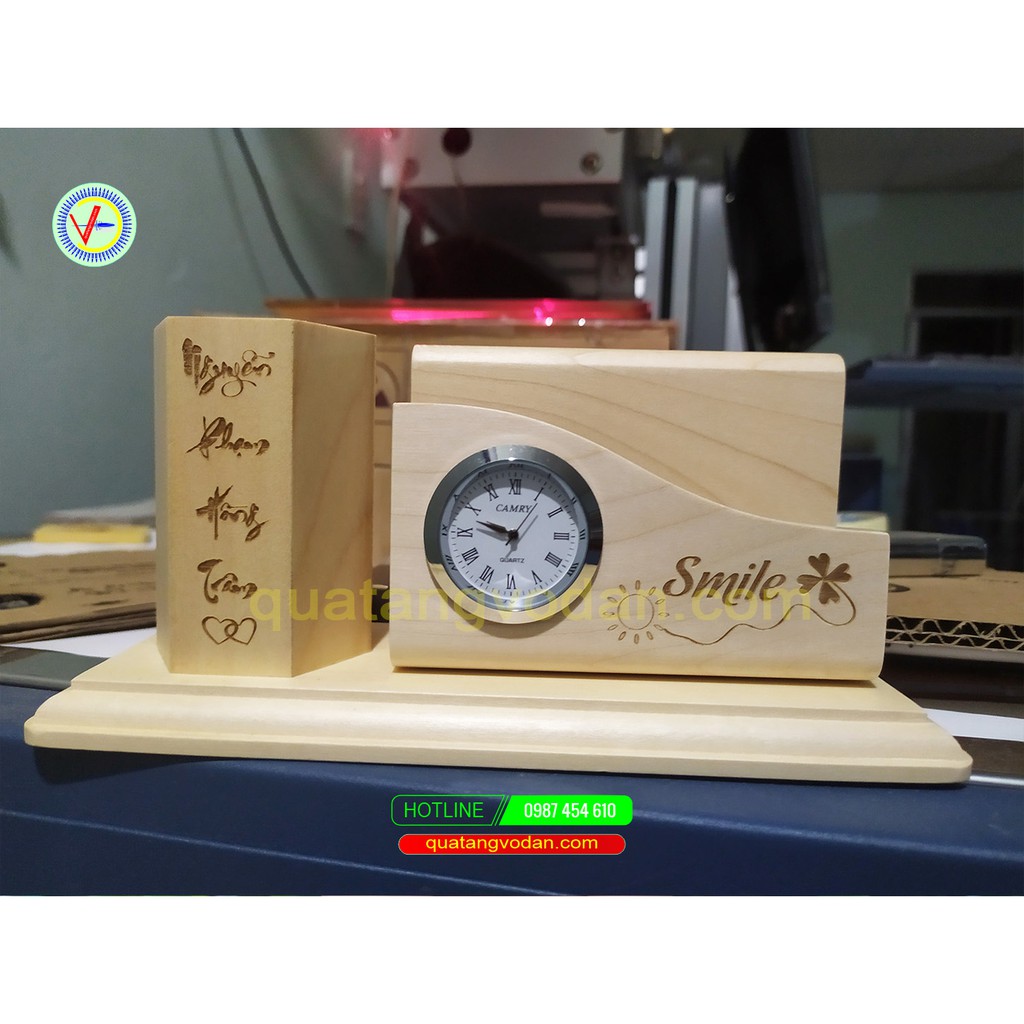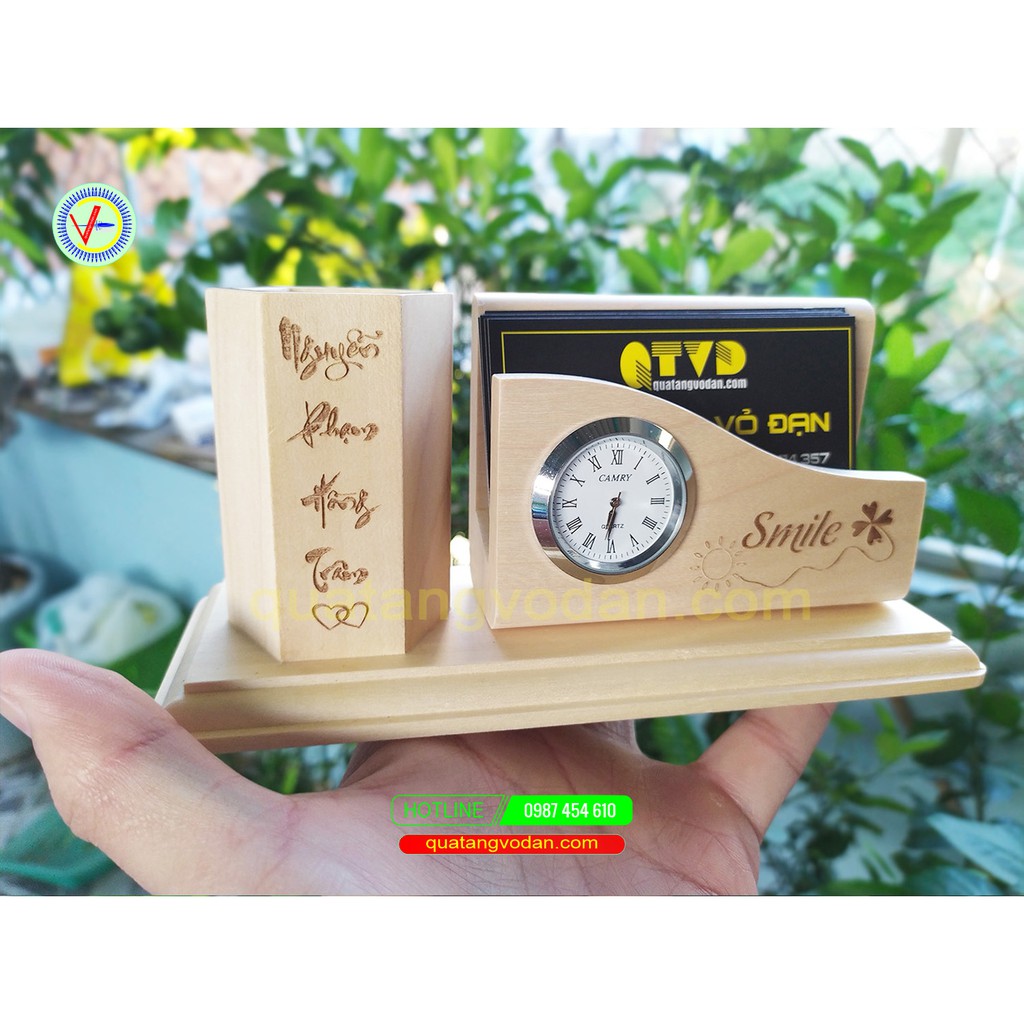 Giới thiệu Kệ cắm bút gỗ kèm khay namecard có đồng hồ khắc theo yêu cầu