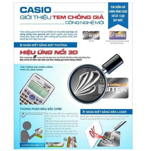 Máy tính Casio DX-120B luôn luôn được dán tem bạc chống giả chính hãng Casio của nhà phân phối Bitex, kèm tờ chỉ dẫn kiểm tra tem, sách hướng dẫn sử dụng bằng tiếng Việt, phiếu bảo hành chính hãng có số serial trùng với số serial in trên máy.