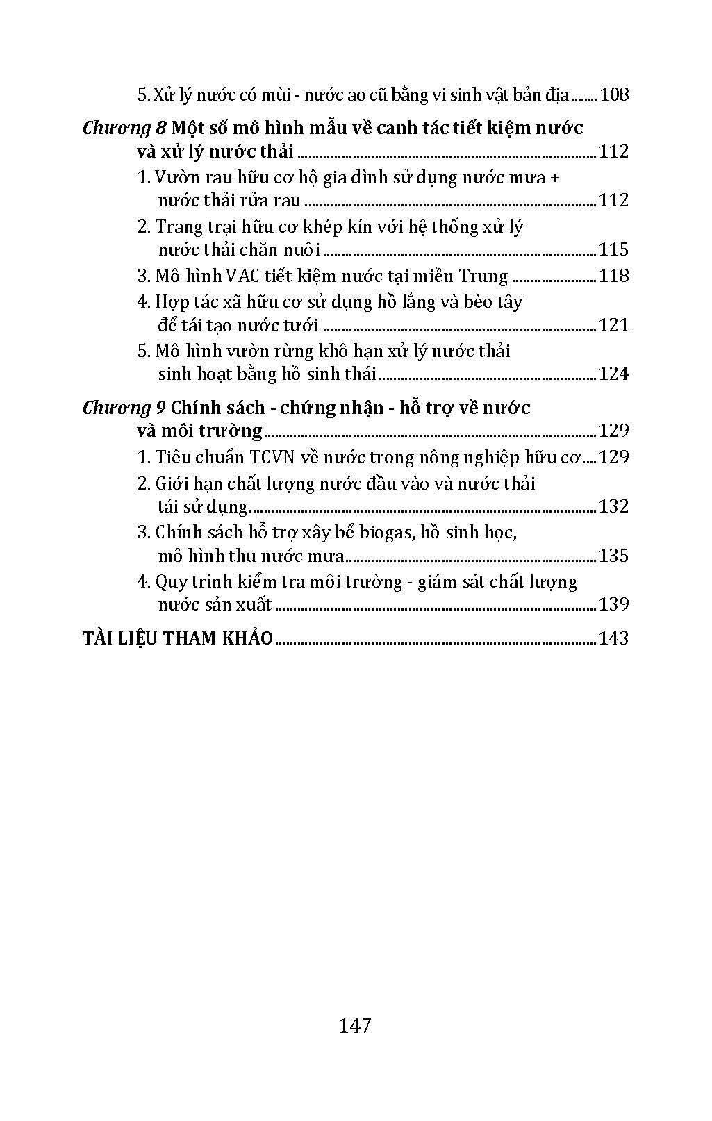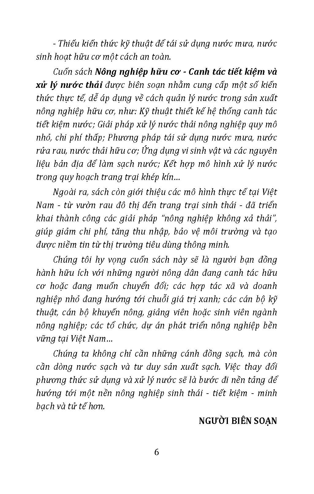 Những kiến thức thực tế về cách quản lý nước trong sản xuất nông nghiệp hữu cơ như: Kỹ thuật thiết kế hệ thống canh tác tiết kiệm nước; Giải pháp xử lý nước thải nông nghiệp quy mô nhỏ; Phương pháp tái sử dụng nước mưa, nước thải hữu cơ; Ứng dụng vi sinh vật và các nguyên liệu bản địa để làm sạch nước; Kết hợp mô hình xử lý nước trong quy hoạch trang trại khép kín… đưa ra các giải pháp“nông nghiệp không xả thải”, giúp giảm chi phí, tăng thu nhập, bảo vệ môi trường.