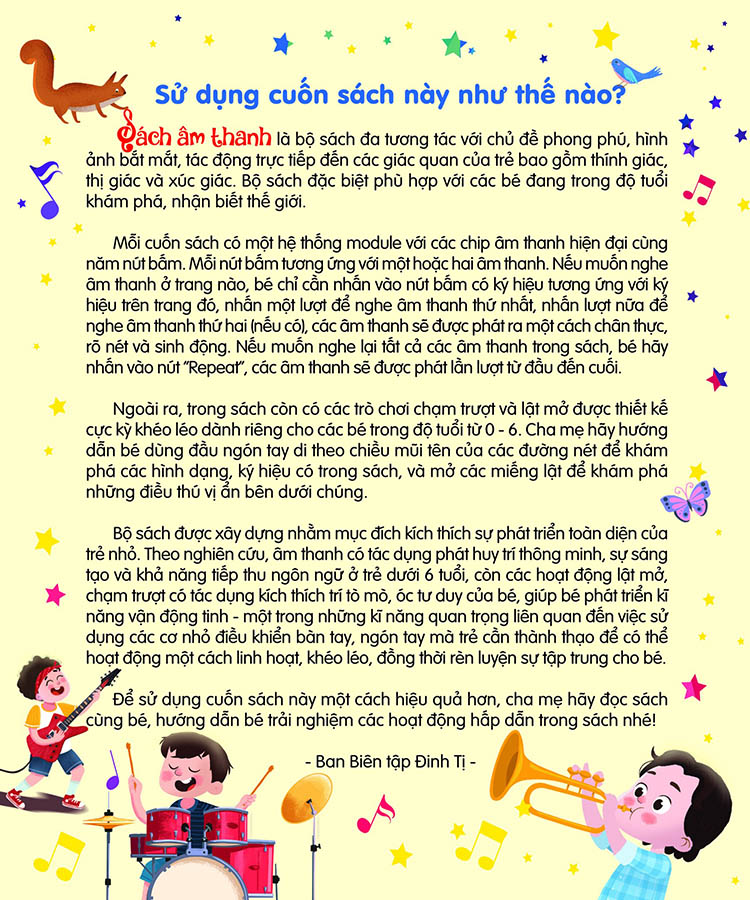 - Sách Âm thanh "made in Việt Nam" là tuyển tập những câu chuyện kể khai thác chủ đề thân thuộc quanh trẻ. Chuyến khám phá này không chỉ có hình ảnh mà còn có cả âm thanh, qua mắt trẻ thế giới bên ngoài được tái hiện vô cùng chân thực.