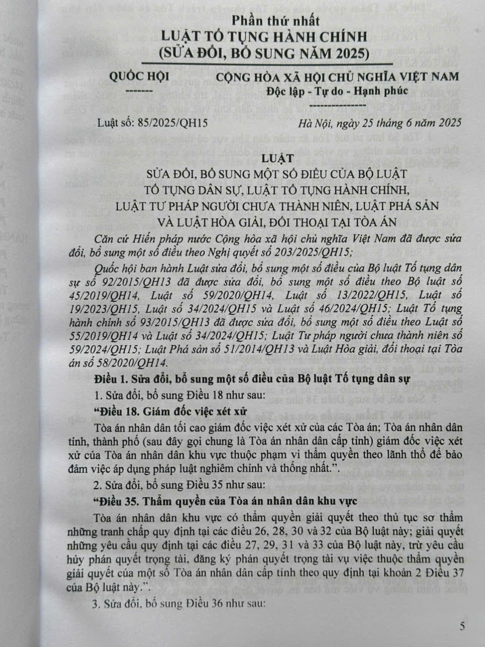 Ngày 25 tháng 6 năm 2025 tại Kỳ họp thứ 9 Quốc hội khóa XV, Quốc hội nước Cộng hòa xã hội chủ nghĩa Việt Nam đã thông qua Luật số 85/2025/QH15 sửa đổi, bổ sung một số điều của Luật Tố tụng hành chính số 93/2015/QH13 đã được sửa đổi, bổ sung một số điều theo Luật số 55/2019/QH14 và Luật số 34/2024/QH15.