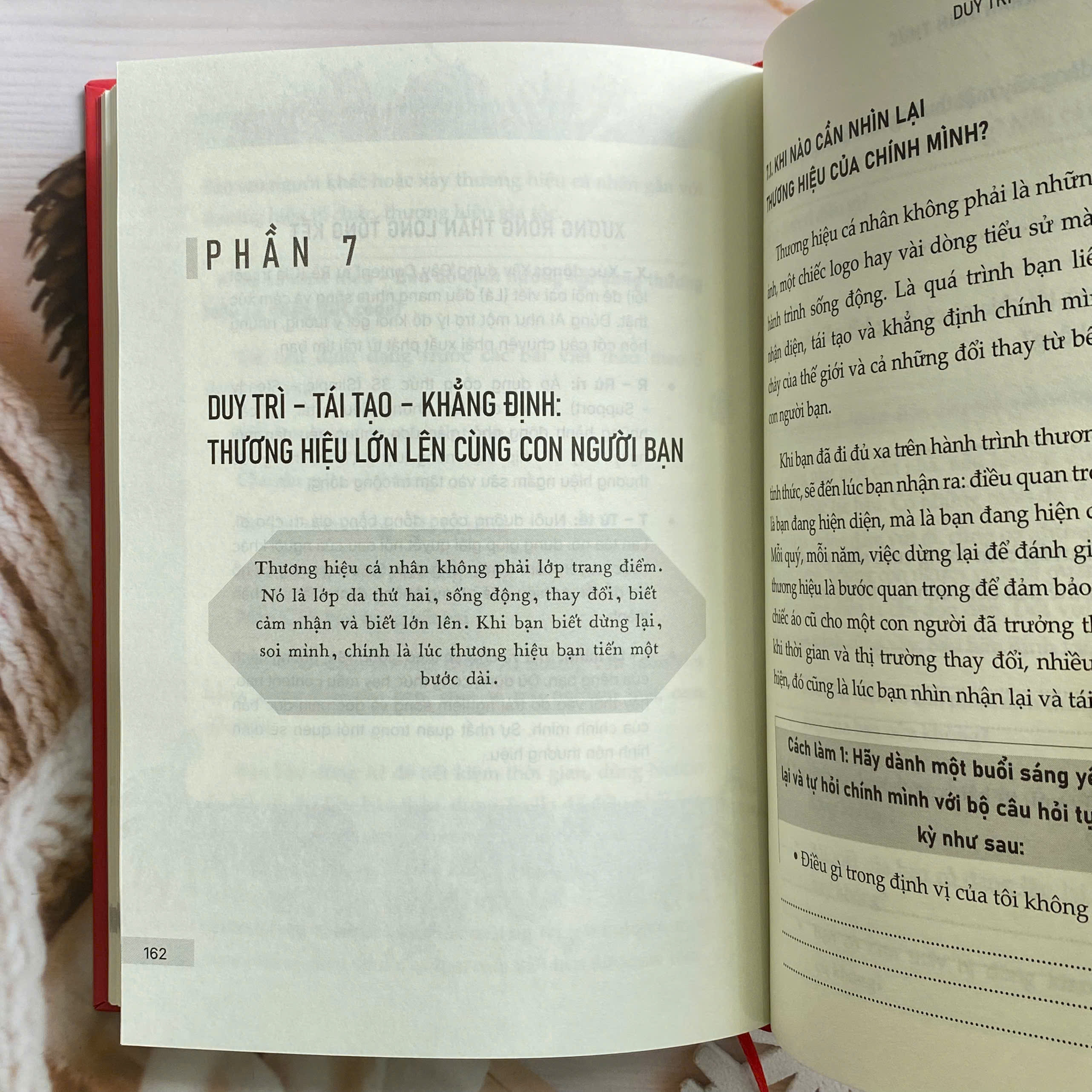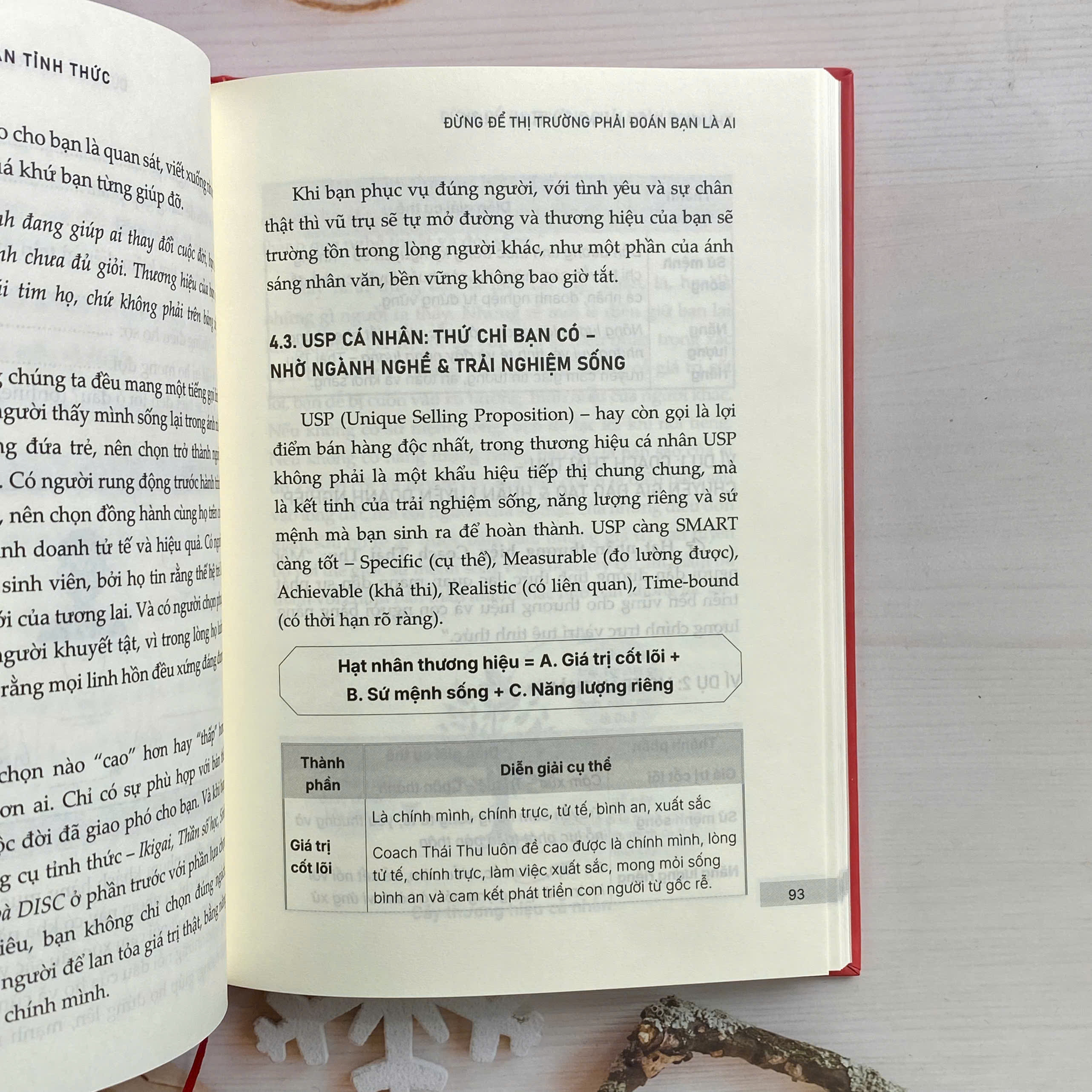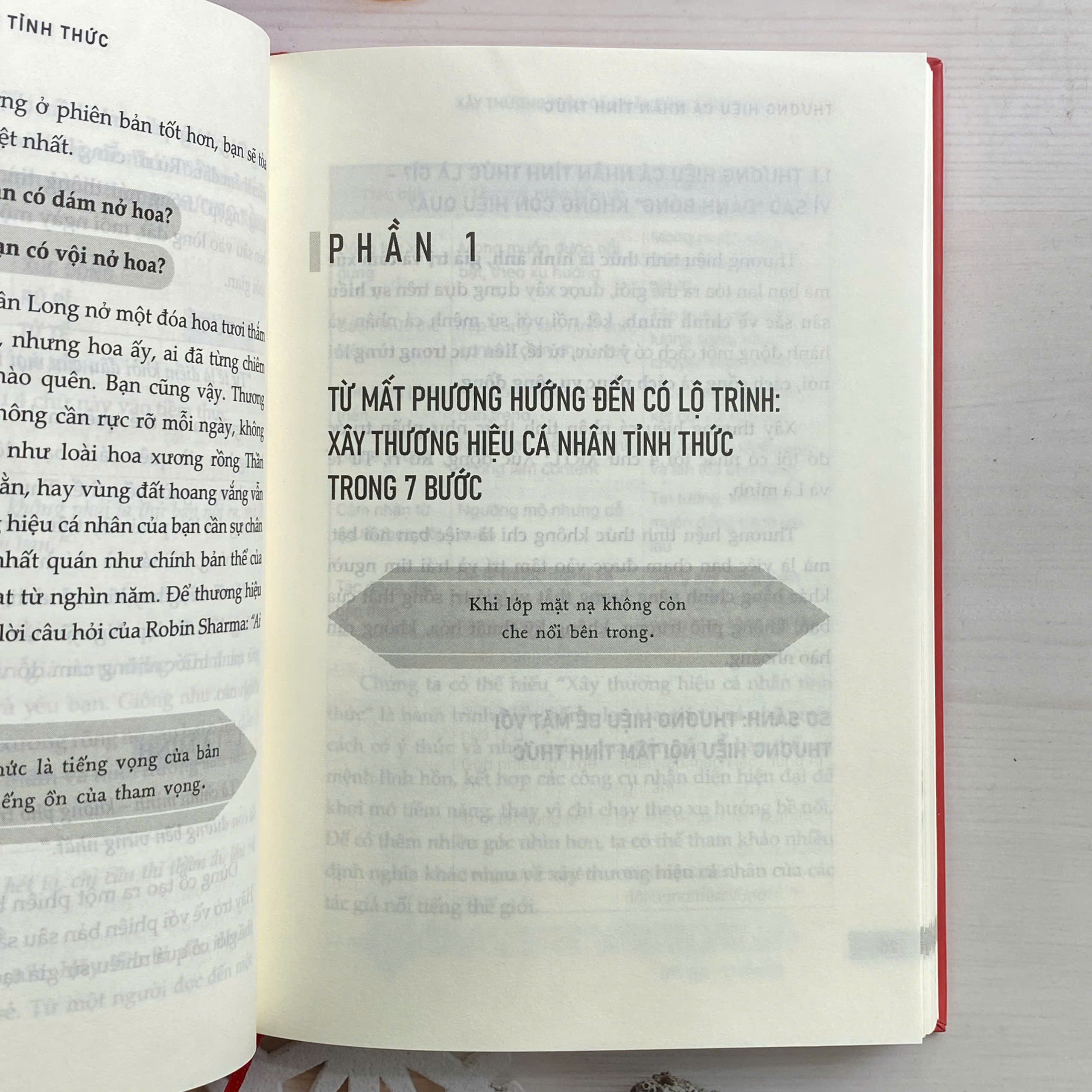 Cuốn sách được thiết kế như một lộ trình 7 bước khoa học và thực tế: Từ việc thức tỉnh để nhận ra mục tiêu thực sự của việc xây thương hiệu; đến việc hiểu mình qua các công cụ thấu hiểu bản thân để tìm ra giá trị cốt lõi; và cuối cùng là khẳng định, giai đoạn mà bạn không còn cần “diễn”, vì bạn chính là thương hiệu trong từng hơi thở.