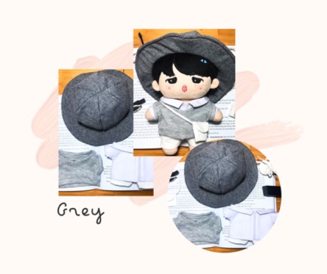 Set outfit bao gồm áo sơ mi , nón vành tròn , áo gile , quần , túi đeo chéo