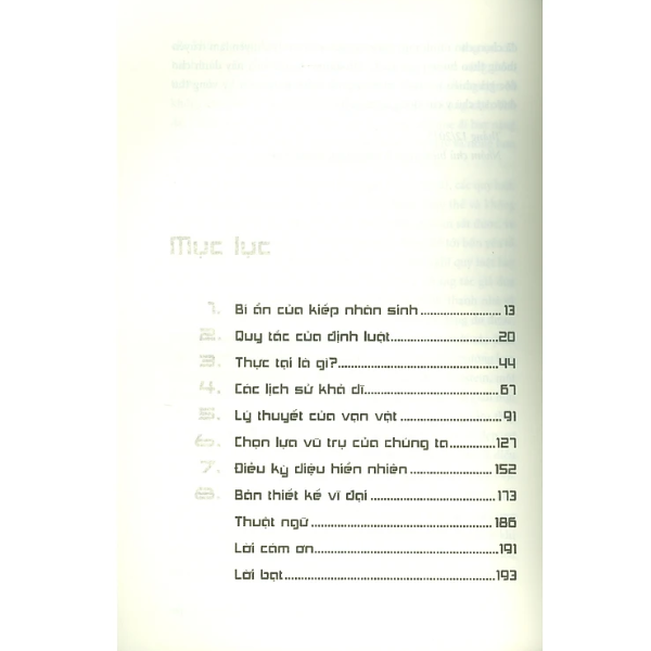 Nội dung cuốn sách, như tác giả nói ngay từ dòng đầu tiên của chương một, là chuyện "Bí ẩn của kiếp nhân sinh", là những câu hỏi tối hậu về sự sống, vũ trụ và vạn vật: Tại sao phải có cái gì đó chứ không phải là hư không?, Tại sao chúng ta tồn tại?, Tại sao là tập hợp các định luật vật lý cụ thể này chứ không phải các tập hợp khác?